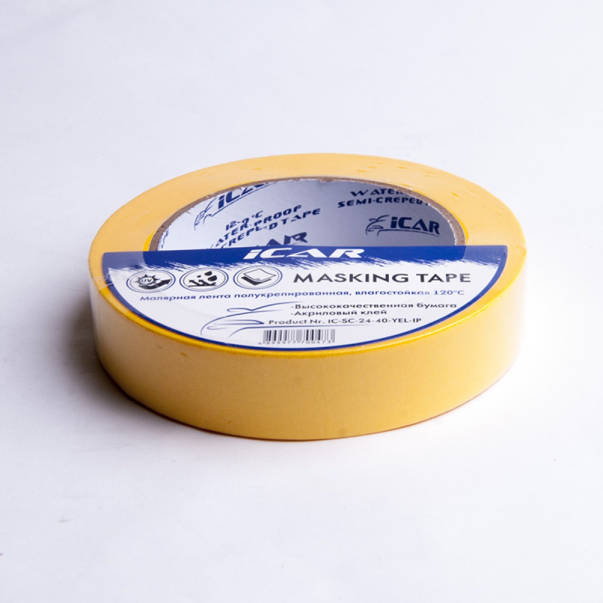 Малярная бумажная клейкая лента IP ICAR Semicrepped 120С ( t=120°C) - специально разработана в качестве маскировочного материала, при проведении малярных работ, в том числе и для работы с водорастворимыми лакокрасочными материалами.
