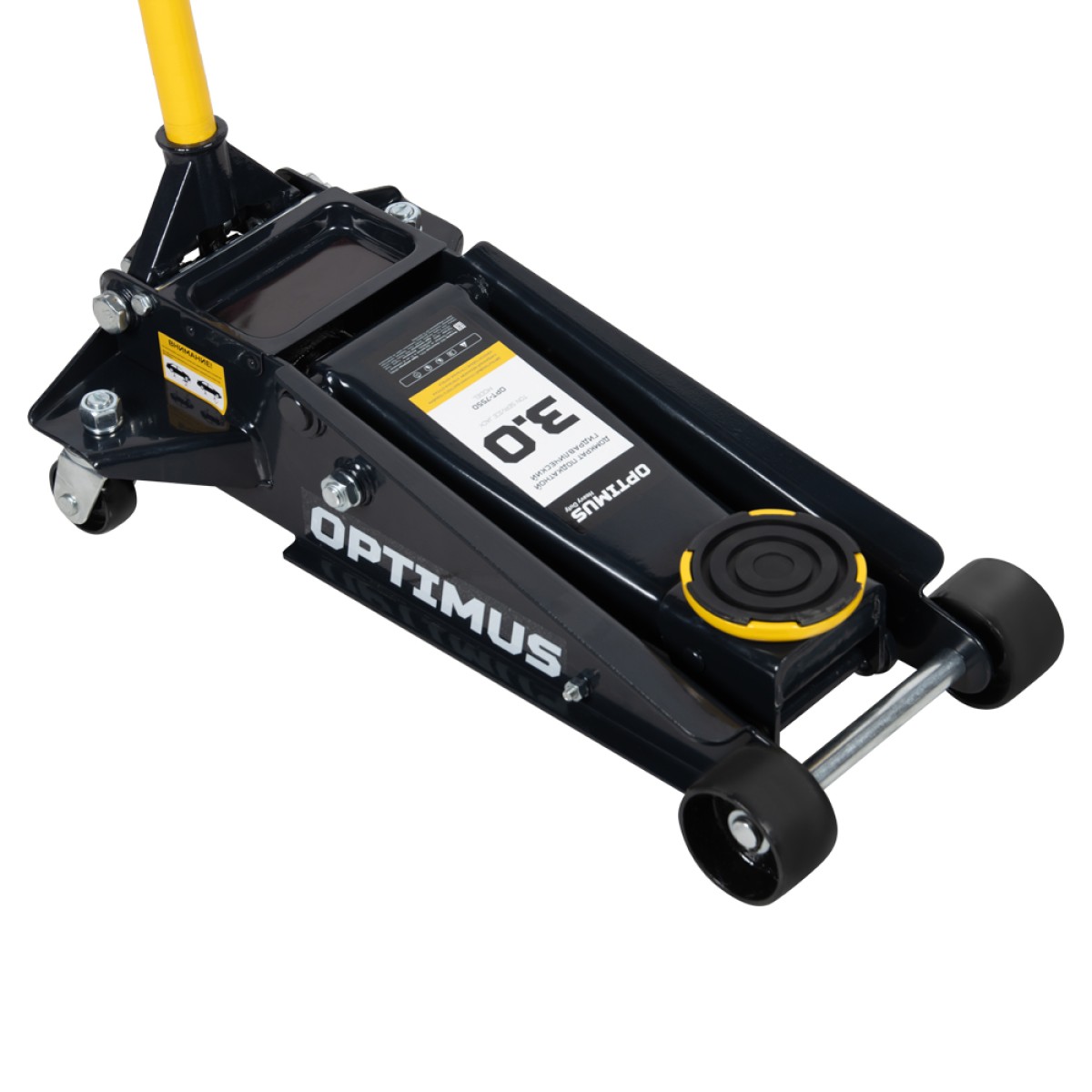 Гидравлический подкатной домкрат OPTIMUS OPT-7450 грузоподъемностью 3000 кг. Высота подъема составляет 500 мм, высота подхвата всего 73 мм, что позволяет производить работы с автомобилями с низким дорожным просветом. Наличие двух усиленных гидроцилиндров и надежного карданного механизма обеспечивает безопасный, быстрый и плавный подъём и спуск автомобиля. Высокопрочная стальная рама с защитой от коррозии обеспечивает долгий срок службы, а магнитный лоток для хранения колёсных гаек делает процесс работы более удобным. Износостойкие усовершенствованные механизмы позволяют использовать домкрат в профессиональной сфере с высокой интенсивностью эксплуатации. Противоударное покрытие рычага и резиновая накладка опорной площадки предотвратят повреждения автомобиля. Широкие износостойкие колеса увеличенного размера позволяют легко перемещать устройство по неровным поверхностям и подкатывать его непосредственно под кузов транспортного средства.