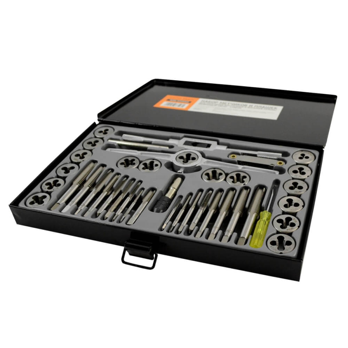 Универсальный набор метчиков и плашек 4NC40-1/2NF20 для прогонки поврежденных и нарезания внутренних и наружных резьб. Все предметы изготовлены из инструментальной легированной стали 9ХС. Позволяет работать с цветными металлами и сталью. Набор поставляется в металлическом кейсе для удобства транспортировки и хранения инструмента. Включает в себя 40 предметов.