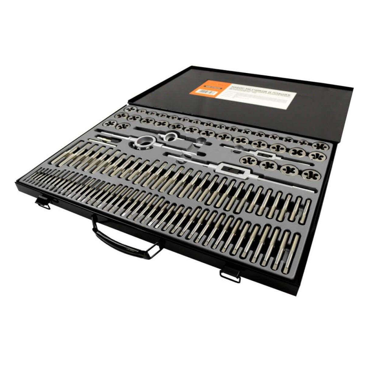 Универсальный набор метчиков и плашек М2-М18 для прогонки поврежденных и нарезания внутренних и наружных резьб. Все предметы изготовлены из инструментальной легированной стали 9ХС. Набор позволяет работать с цветными металлами и сталью. Набор поставляется в металлическом кейсе для удобства транспортировки и хранения инструмента. Включает 110 предметов.