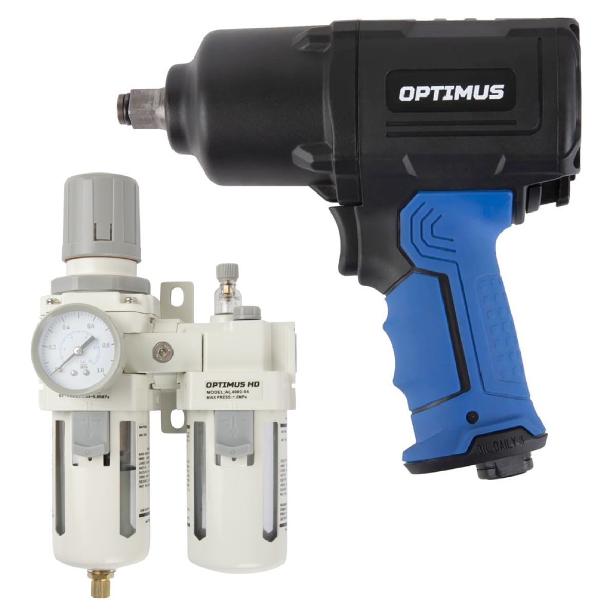 Пневматический ударный гайковерт OPTIMUS OPT-PW2050M в комплекте с блоком подготовки воздуха 1/2″ AC4010-04 (фильтр, манометр, маслораспылитель и регулятор давления). Предназначен для проведения монтажных и демонтажных работ с крепежом, работает от источника сжатого воздуха. Используется на СТО, производственных предприятиях, в сборочных цехах. Надежный и долговечный ударный механизм Twin Hammer обеспечивает мгновенный сбалансированный удар и минимальную вибрацию. Модель OPT-PW2050M оснащена пятью режимами работы: 4 на закручивание и 1 максимальный на откручивание. Благодаря кнопочному переключателю можно управлять направлением вращения и работать одной рукой. Легкий и прочный композитный корпус защищает внутреннее устройство от механических воздействий. Подходит для работы как с мягкими, так и с жесткими соединениями.