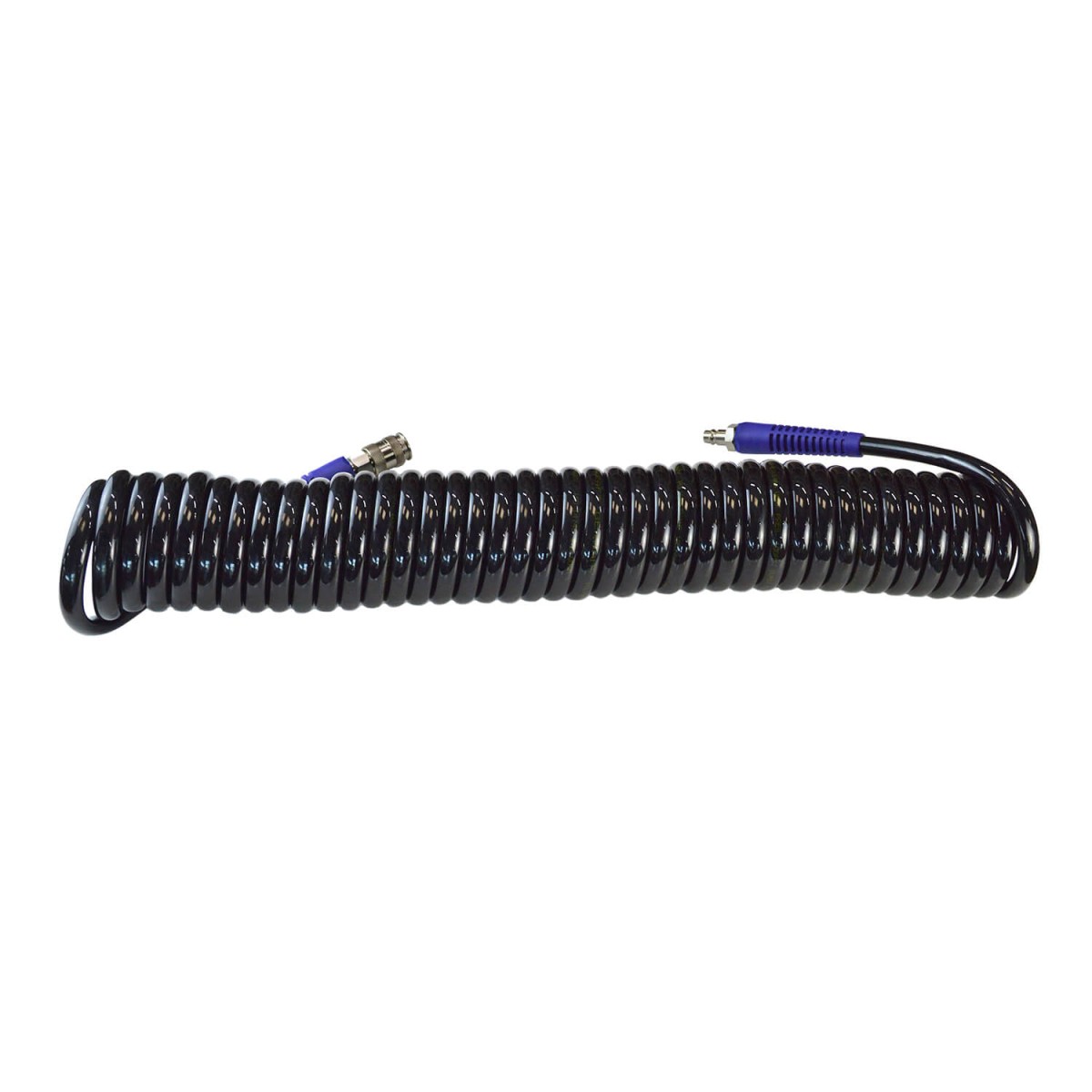 Шланг пневматический полиуретановый с фитингами БРС. Шланг витой, длина до 10 метров, внутренний диаметр 10 мм, внешний диаметр 14 мм. Цвет: черный.