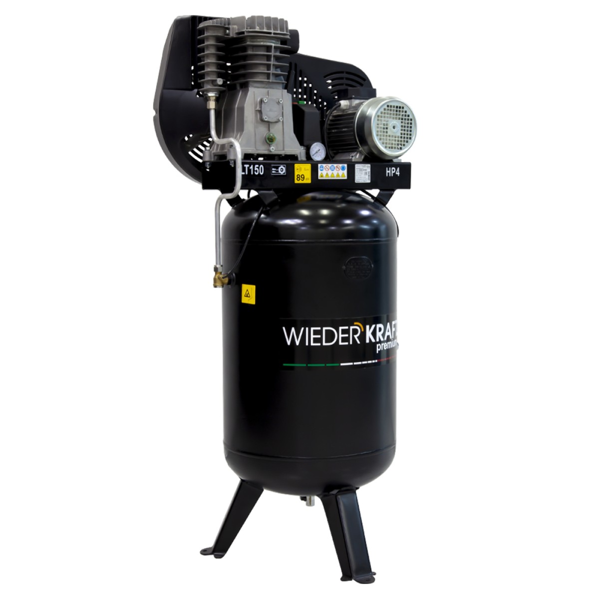 Профессиональный поршневой компрессор с ременным приводом, вертикальным ресивером на 150 литров и производительностью 453 л/мин.