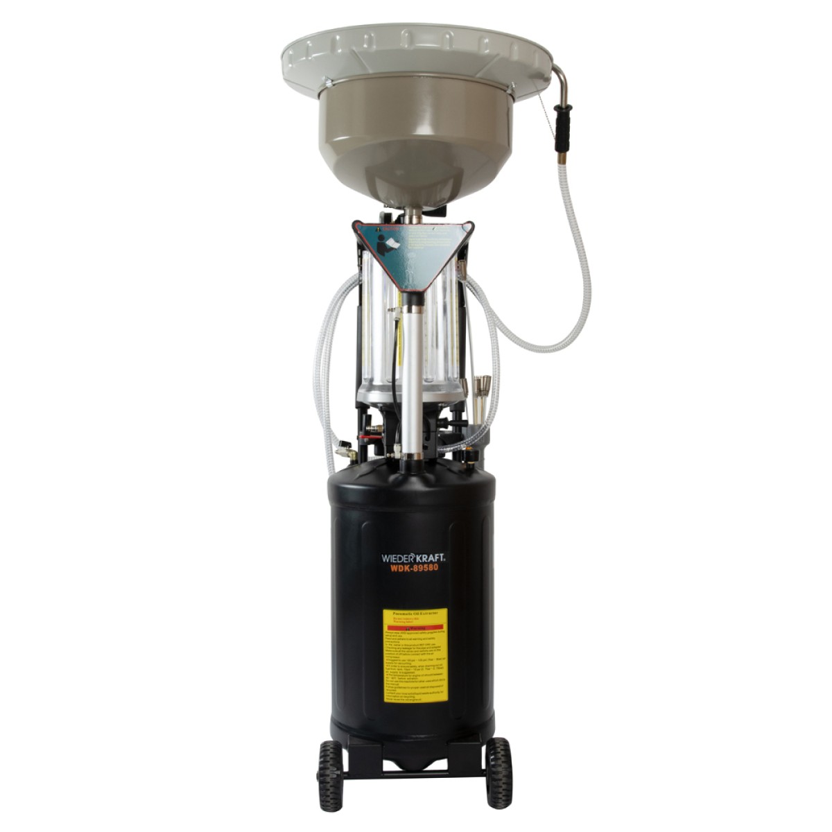Установка для откачки и слива масла WiederKraft WDK-89580 с предкамерой, увеличенной воронкой, пневматическим регулированием высоты и баком на 75 литров. Предназначена для удаления отработанного масла и других жидкостей из любого транспортного средства при помощи внутри-вакуумной вытяжной системы или свободным сливом. Используется как сливное устройство со свободным сливом отработанного масла из двигателей, коробок передач и дифференциалов всех транспортных средств. Применяется для обслуживания любых видов двигателей внутреннего сгорания. Установка мобильна и проста в эксплуатации. Включает шесть гибких щупов для извлечения жидкости через отверстие щупа контроля уровня масла автомобиля. Установка снабжена специальным лотком для хранения инструмента и деталей. Регулируемая воронка для сбора масла может быть установлена на необходимой для работы высоте (от 1205 до 1805 мм). Оборудование укомплектовано краном в воронке для сбора масла, для контроля состояния сливаемого масла перед началом слива в резервуар. Возможность самоочистки делает работу с устройством чистой и легкой. Осмотровая колба позволяет визуально оценить качество отработанного масла, имеющиеся недостатки двигателя.
