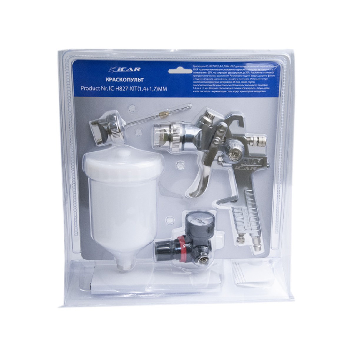 Краскопульт пневматический ICAR H827-Kit с верхним бачком 600мл, набор, сопло 1.4мм+1.7мм. является оборудованием профессионального типа.