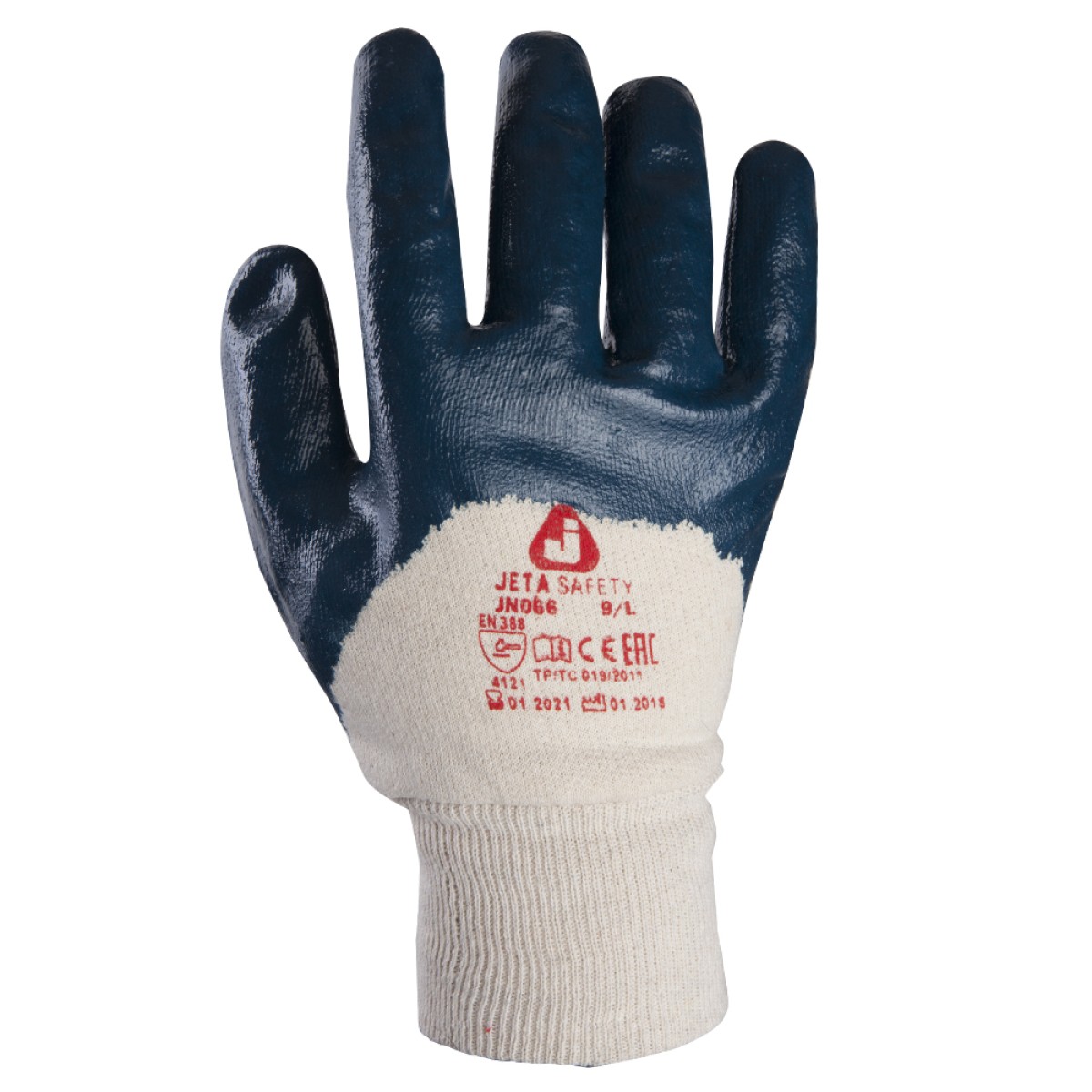 JETA SAFETY JN-066 Atlant Flex — удобные и практичные защитные перчатки с маслобензостойким нитриловым покрытием на 3/4 ладони для грубой и тяжелой работы. Джерсовая подкладка выполнена из 100% хлопка. Вязаная манжета надежно удерживает перчатку на запястье. Степень защиты от механических повреждений 4121: 4 — устойчивость к истиранию, 1 — устойчивость к порезам, 2 — устойчивость к разрывам, 1 — устойчивость к проколам.