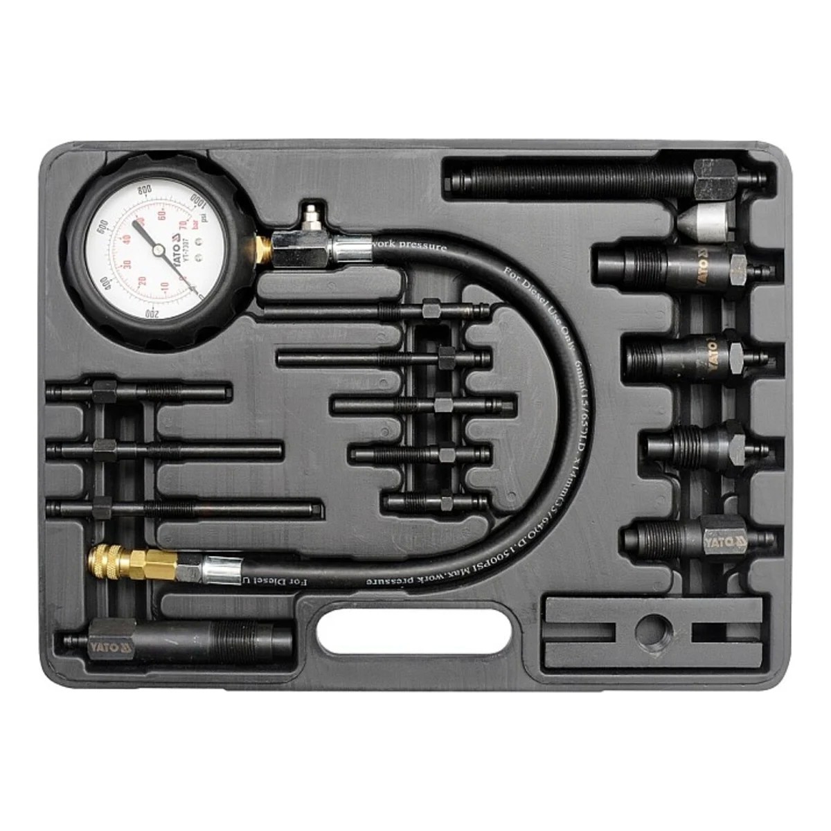 Набор YATO для измерения компрессии в дизельных двигателях 16 предметов пластиковый кейс YT-7307 используется во время сезонного техосмотра автомобиля или во время ремонта по причине возникновения неполадок в системе подачи топлива (поршень, цилиндр). Благодаря большому количеству адаптеров, входящих в комплект, проверку давления рабочей жидкости можно осуществлять в большинстве существующих автомобилей, оснащенных дизельным двигателем: VW, Audi, Seat, Skoda, Fiat, Alfa Romeo, Lancia, Peugeot, Ford, Opel, Toyota, Mercedes, Rover. Устройство предназначено для профессионального использования в автосервисах. Адаптеры изготовлены из стали С45, что обеспечивает долгий срок службы инструмента.