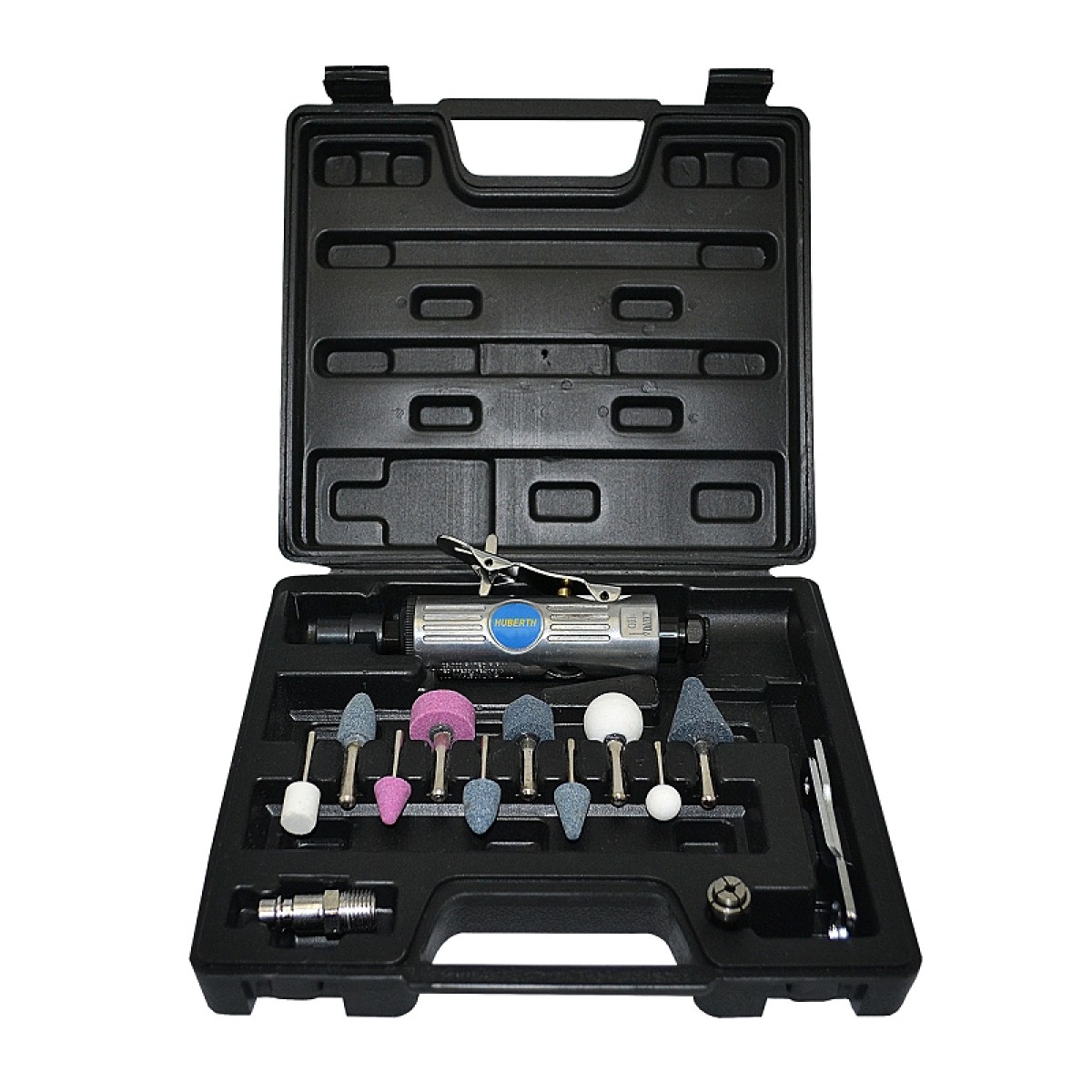 Легкая пневматическая зачистная машинка с набором шлифовальных насадок.