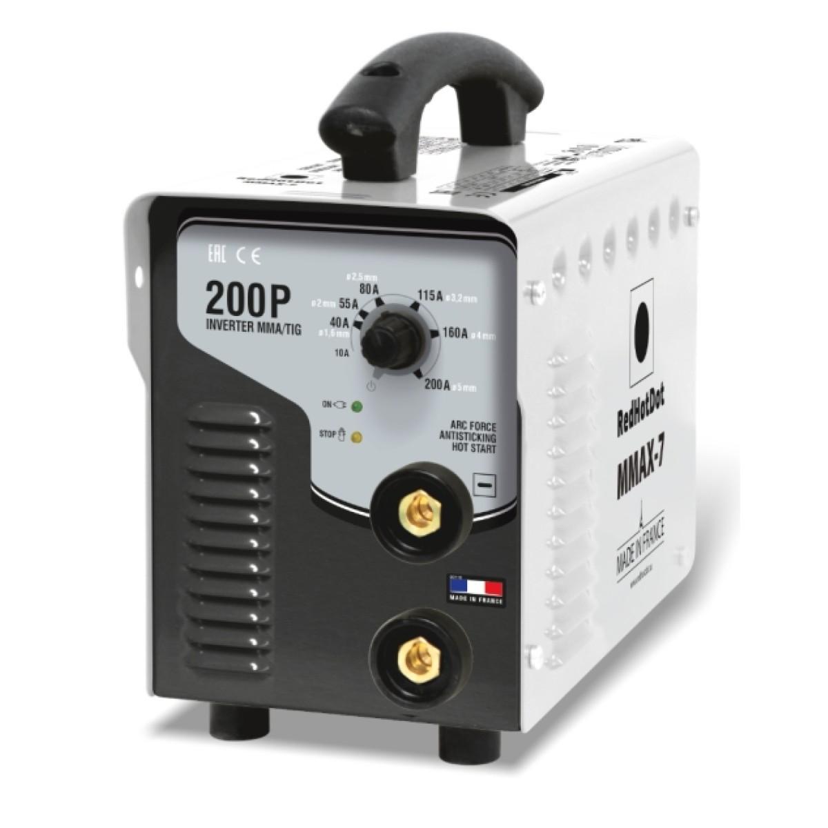 Аппарат MMAX-7 с инверторным генератором для сварки без газа штучными электродами с покрытием. Могут использоваться электроды диаметром до 5 мм как с обычным покрытием, так и для сварки чугуна и нержавеющей стали. Аппарат управляется простым поворотным регулятором с настройкой сварочного тока в диапазоне от 10 до 200 А. Отличается малыми размерами и небольшим весом.