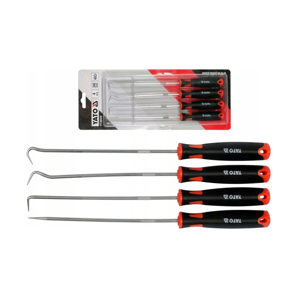 Набор длинных крючков YATO 4 предмета YT-08429 - набор крючков с ручкой. Крючки имеют закаленные и хромированные наконечники из стали 40 CR. Ручки изготовлены из двухкомпонентного материала, что облегчает надежный хват.