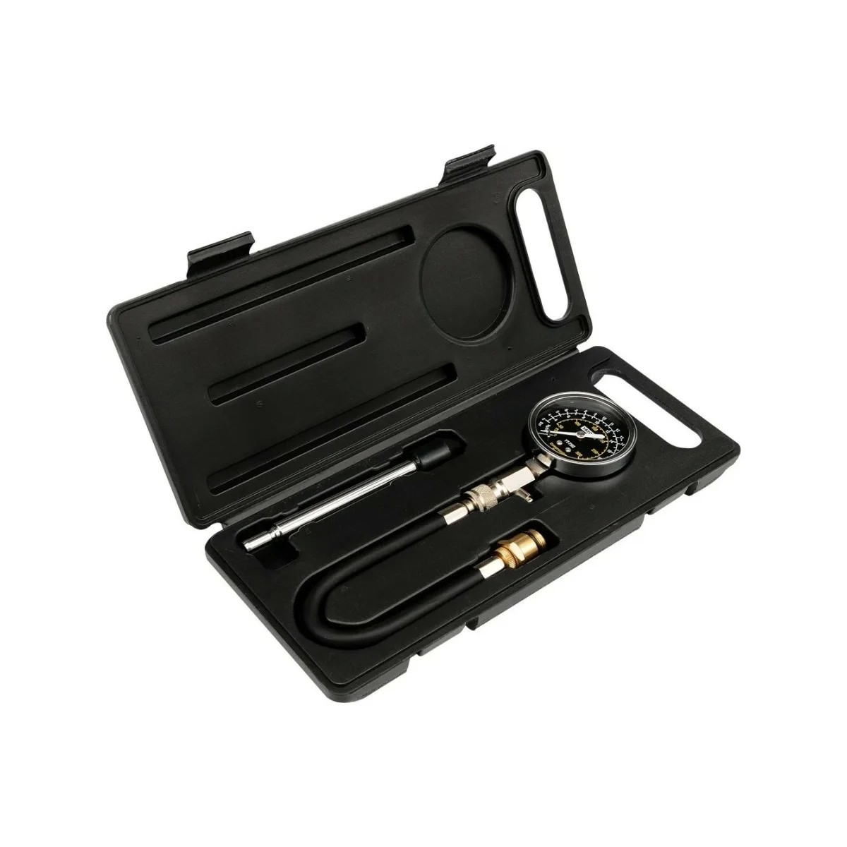 Набор для измерения компрессии YATO 21 бар YT-7302 используется во время сезонного техосмотра или во время ремонта по причине возникновения неполадок для измерения и контроля компрессии в цилиндрах бензиновых ДВС у легковых автомобилей, грузовиков и мотоциклов. Измерения производятся на прогретом моторе через отверстия для свечей зажигания. Устройство предназначено для профессионального использования в автосервисах. Наличие гибкого шланга позволяет осуществлять необходимые операции без демонтажа элементов, затрудняющих доступ к свечным отверстиям. Такая конструкция обеспечивает дополнительное удобство при работе с компрессометрами. Для удобства использования и транспортировки набор упакован в пластиковый кейс.
