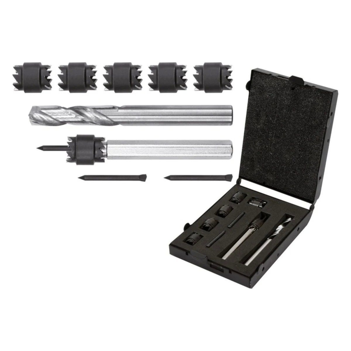 Набор YATO YT-28920 предназначен для быстрого снятия сварных швов. Включает в себя 6 двусторонних корончатых сверл, зажимной патрон, 3 поворотных оправки и специальное сверло из быстрорежущей стали 8 мм.