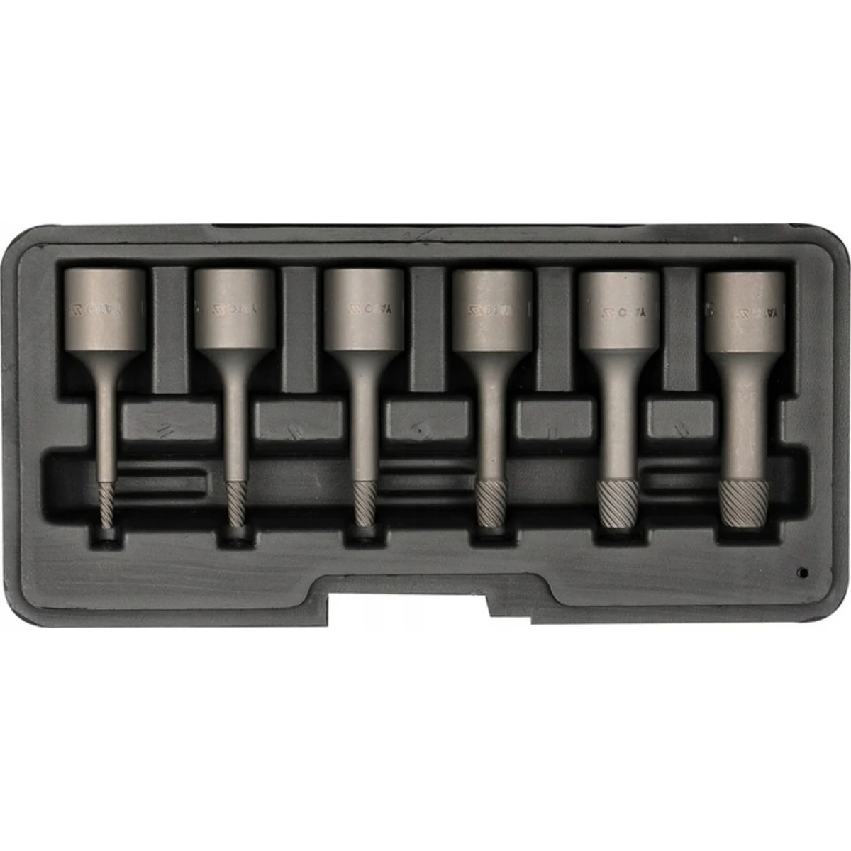 На первом этапе работы просверлите отверстие диаметром примерно на 1/3 меньше диаметра шурупа, затем отрегулируйте экстрактор на соответствующий диаметр и вкрутите его в шуруп с помощью ручки 3/8" слева. - вращение рук. Экстрактор фиксируется в винте, позволяя вынуть его из отверстия. На этом этапе работы экстрактор может быть окончательно заблокирован поврежденным винтом.