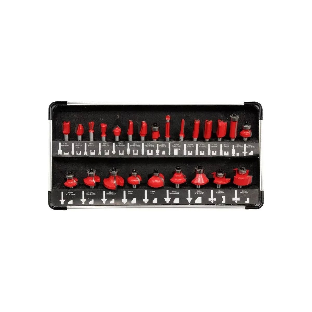 Набор фрез по дереву YT-6801. Стержень диаметром 8 мм, головки с профилированными режущими пластинами из карбида кремния YG6X. Серебристая пайка, допуск на размеры 0,08 мм. Фрезы имеют кромки и подшипники для облегчения управления фрезерным станком.