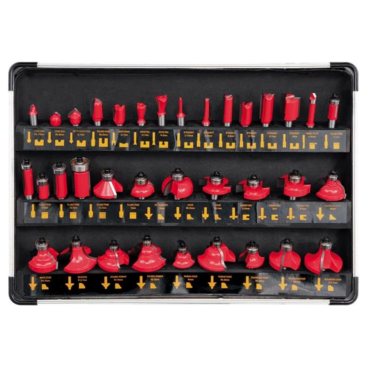Оснастка изготовлена из инструментальной стали, головки снабжены профильными режущими пластинами из карбида кремния YG6X. Размерные допуски 0.08 мм. Фрезы для обработки кромки снабжены подшипниками для облегчения работы на фрезерном станке. Набор поставляется в кейсе с крышкой из стекла для легкого и быстрого выбора соответствующих инструментов.