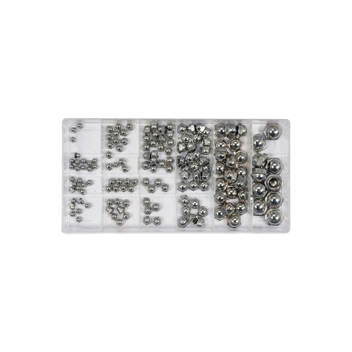 Набор из 150 метрических колпачковых гаек. В комплект входят размеры М3, М4, М5, М6, М8, М10. Все колпачковые гайки помещены в удобную упаковку типа «сортировщик».