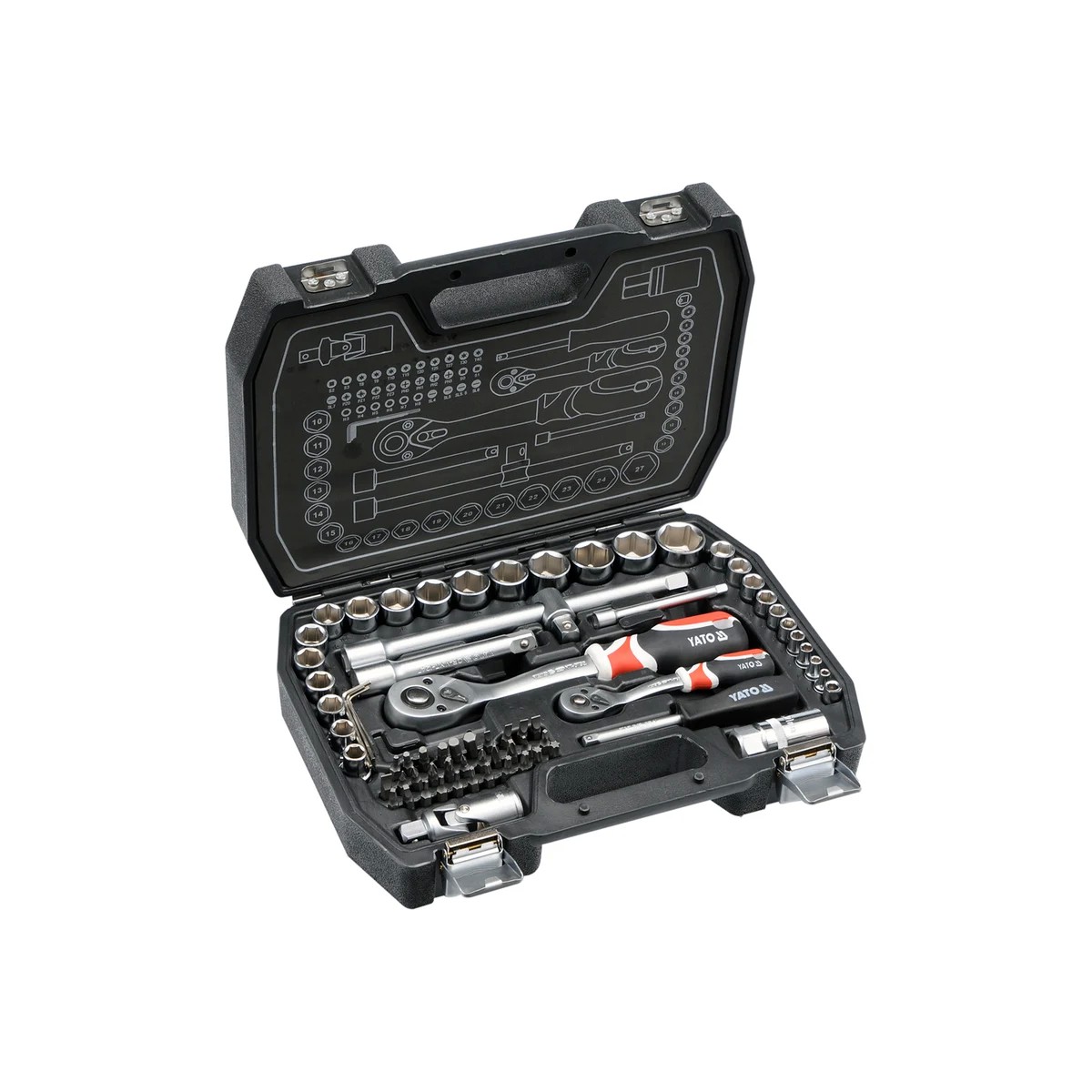 Набор инструментов YATO 1/4'' и 1/2'', 72пр YT-38782 представляет собой профессиональный комплект, разработанный для специализированных автомобильных и механических сервисов. Торцевые ключи и привод торцевых головок изготовлены из прочной инструментальной хромованадиевой стали CrV 50BV3. Колпачки изготавливались методом штамповки, а перед процессом закалки калибровались с помощью точных калибров и контрольных приборов.