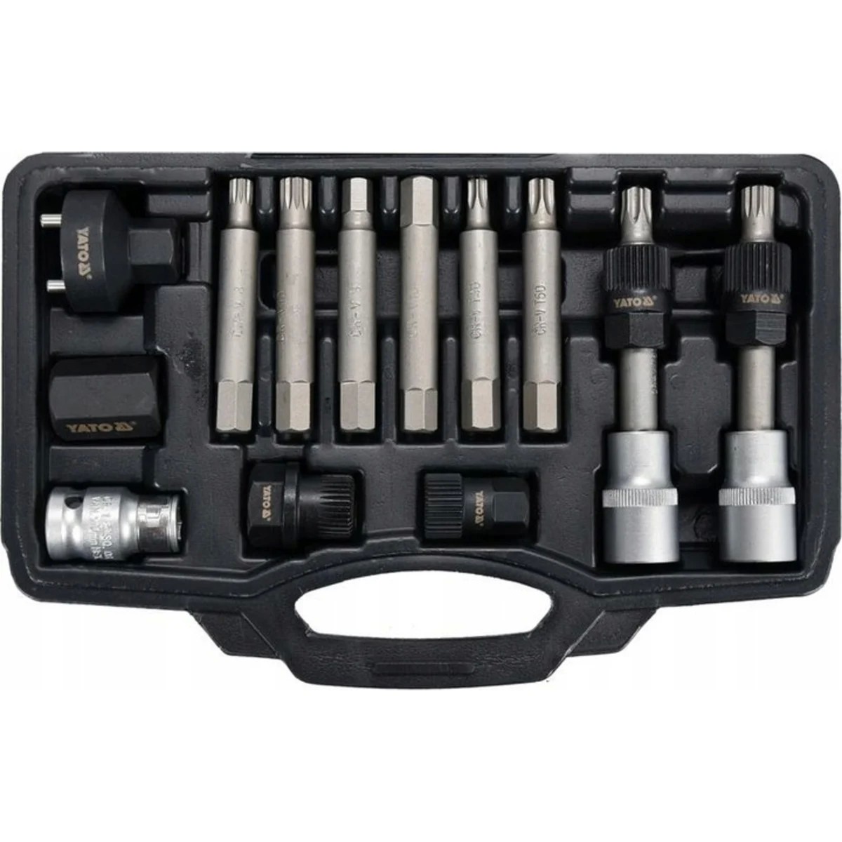 Набор ключей для разборки генератора YATO, 13 предметов YT-0421 предназначен для работы с генераторами Bosch и Magneti Marelli. При помощи соответствующих битов поможет одновременно отвинтить крепежный болт шкива и удерживать колесо со сцеплением, используя специальное крепление.
