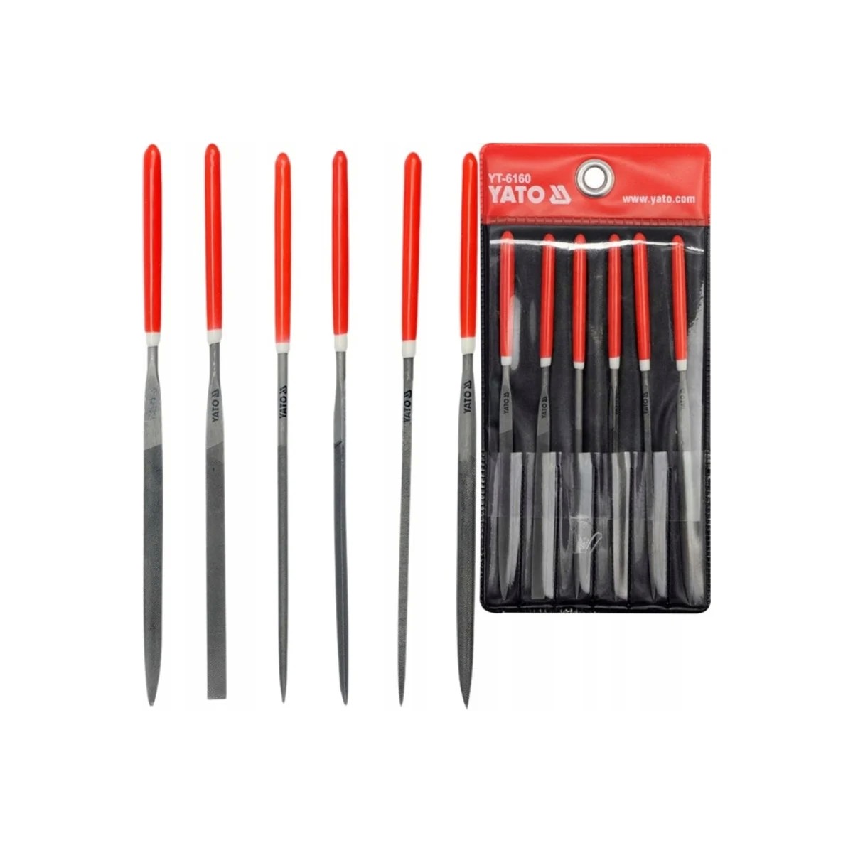 Набор надфилей YATO 140x65мм 6пр YT-6160 предназначен для выполнения мелких слесарных работ с заготовками из особо твердых материалов, таких как: металлы, керамическая плитка, стекло и пр. Инструменты очень удобны в применении, так как оснащены пластиковыми ручками. Надфили изготовлены из высокоуглеродистой стали, профили имеют двойную перекрестную насечку. В набор вошли 6 предметов, по одному надфилю следующих типов: плоский, плоский заостренный, полукруглый, круглый, трехгранный, ножевой.