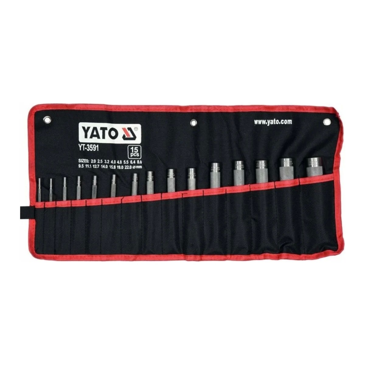 Набор пробойников YATO 15пр YT-3591изготовлен из закаленной углеродистой стали № 45. Пробойники шлифованные и полированные. В набор входят модели самых распространенных размеров.Имеют отверстия для снятия нарезанного материала, поверхность захвата рифленая, упакована в футляр.