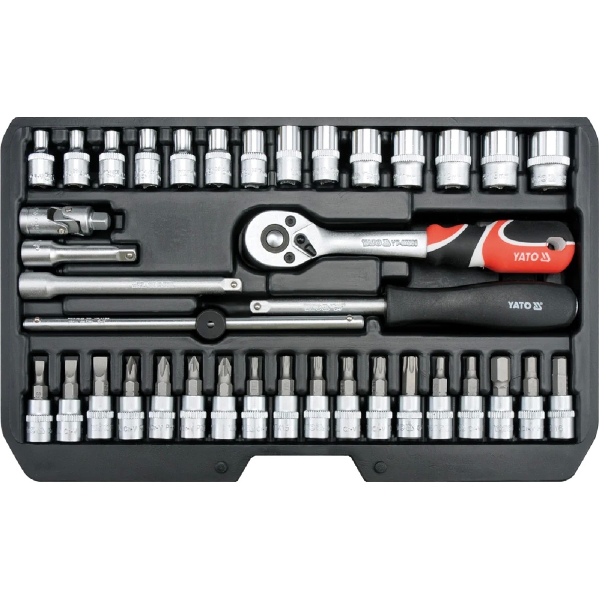 Набор торцевых головок и бит YATO 1/4, 38пр.XS YT-14471 предназначен для удовлетворения потребностей профессиональных автомобильных и механических служб. Инструмент изготовлен из прочной инструментальной стали, хромованадиевой CrV 50BV30. Храповик из стали CrV 6140 имеет 72 зубца и изготовлен по самым высоким технологическим стандартам. В комплект входят биты из твердой стали S2.