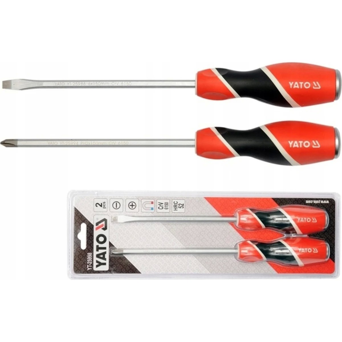 Набор ударных отверток YATO 2шт YT-25998 состоит из двух профессиональных отверток: шлицевой и крестовой, что позволяет использовать его в быту и профессиональной деятельности для работы с широким спектром винтов и шурупов. Шток отверток изготовлен из стали с символом CrV6150 и имеет атласную поверхность.