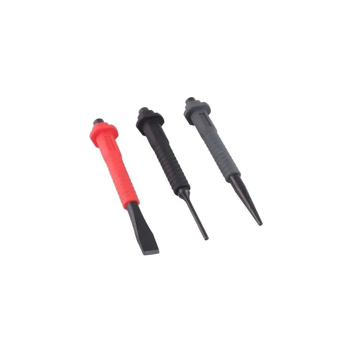 В набор входят три основных инструмента - долото 10х125мм, цилиндрический пробойник 3х125мм и конусный пробойник 3х125мм. Выкованы из стали CrV, имеют пластиковые ручки с защитными накладками, поверхность инструментов воронена. Набор собран в пластиковый контейнер.