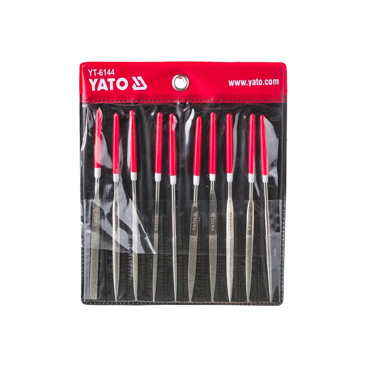 Алмазные надфили YATO 3x140x50мм 10 предметов YT-6144 включает в себя инструмент, который имеет перекрестную насечку. Она позволяет работать с изделиями под любым углом.