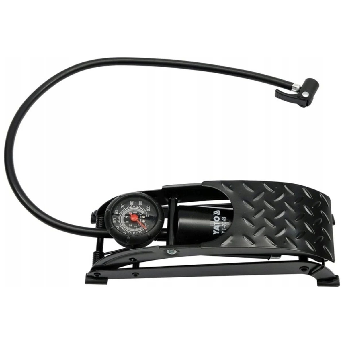 Однопоршневой ножной насос прочной конструкции, изготовленный из тисненого лакированного стального листа толщиной 3 мм. Манометр с показаниями до 7 бар.
