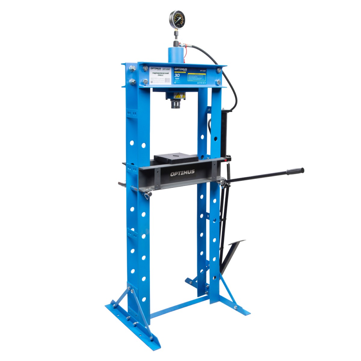 Напольный гидравлический пресс OPTIMUS OPT-230F, оснащенный ручным и ножным приводом и обеспечивающий усилие в 30000 кг. Применяется в машиностроении и металлообработке, на различных производствах для запрессовки или выпрессовки втулок, коленвала, снятия или установки подшипников для автомобиля, сжатия всевозможных деталей, для гибки арматуры или листового металла. Жидкостный манометр, защищенный от гидроудара, упрощает контроль за развиваемым усилием. Рабочий стол легко и просто регулируется по высоте от 350 до 1350 мм, что позволяет устанавливать детали различных габаритов. Цилиндр имеет возможность горизонтального перемещения для работы по всей плоскости стола. Армированный шланг пресса отличается устойчивостью к заломам, что увеличивает общий срок службы станка. Отверстия станины позволяют регулировать высоту рабочего стола в зависимости от габаритов обслуживаемой детали. Удлиненные опоры и прочная сварная рама обеспечивают устойчивость станка.
