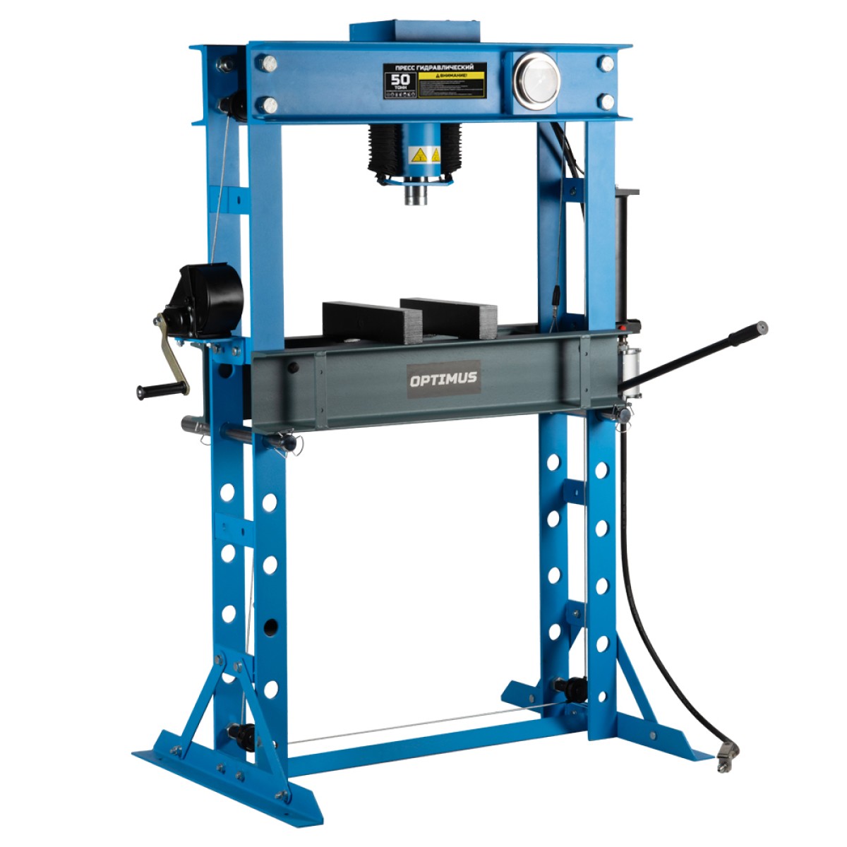 Напольный пневмогидравлический пресс OPTIMUS OPT-250, который обеспечивает усилие в 50000 кг. Используется для выпрессовки подшипников и втулок, правки валов, осей, профилей, для прессования заготовок и др. Рабочий стол легко и просто регулируется по высоте от 170 до 870 мм, что позволяет устанавливать детали различных габаритов. Регулировка рабочего стола осуществляется с помощью лебёдки. Глицериновый манометр расположен на уровне глаз для удобства эксплуатации. Порошковое покрытие корпуса препятствует образованию коррозии. Жесткая и прочная сварная рама обеспечивает долговечность оборудования даже при интенсивной эксплуатации.