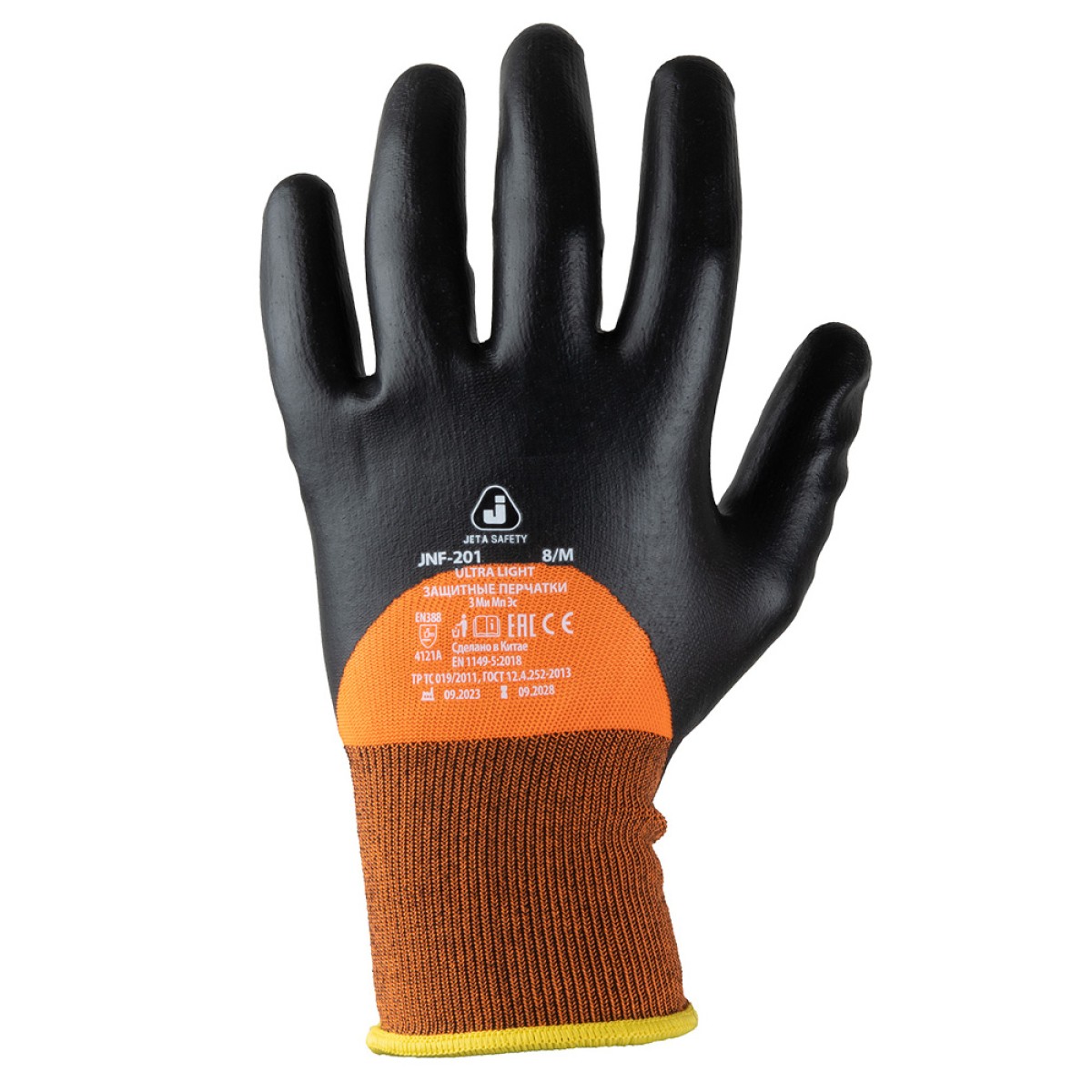 JETA SAFETY JNF-201 Ultra Light — защитные трикотажные перчатки с пенонитриловым покрытием на 3/4 от всех площади поверхности. Имеют яркий сигнальный цвет. Обеспечивают отличный хват. Плотная манжета отлично фиксирует изделие на руке. Универсальная модель подходит для работ, связанных с повышенным количеством загрязнений, влаги и воды, работы с маслами, смазками и нефтепродуктами в ограниченном количестве. Используется в сборочно-монтажных работах, работах операторов машин и механизмов, строительно-конструкторских работах, столярных работах, а также в машиностроении, транспортировочных, складских и ремонтных работах.