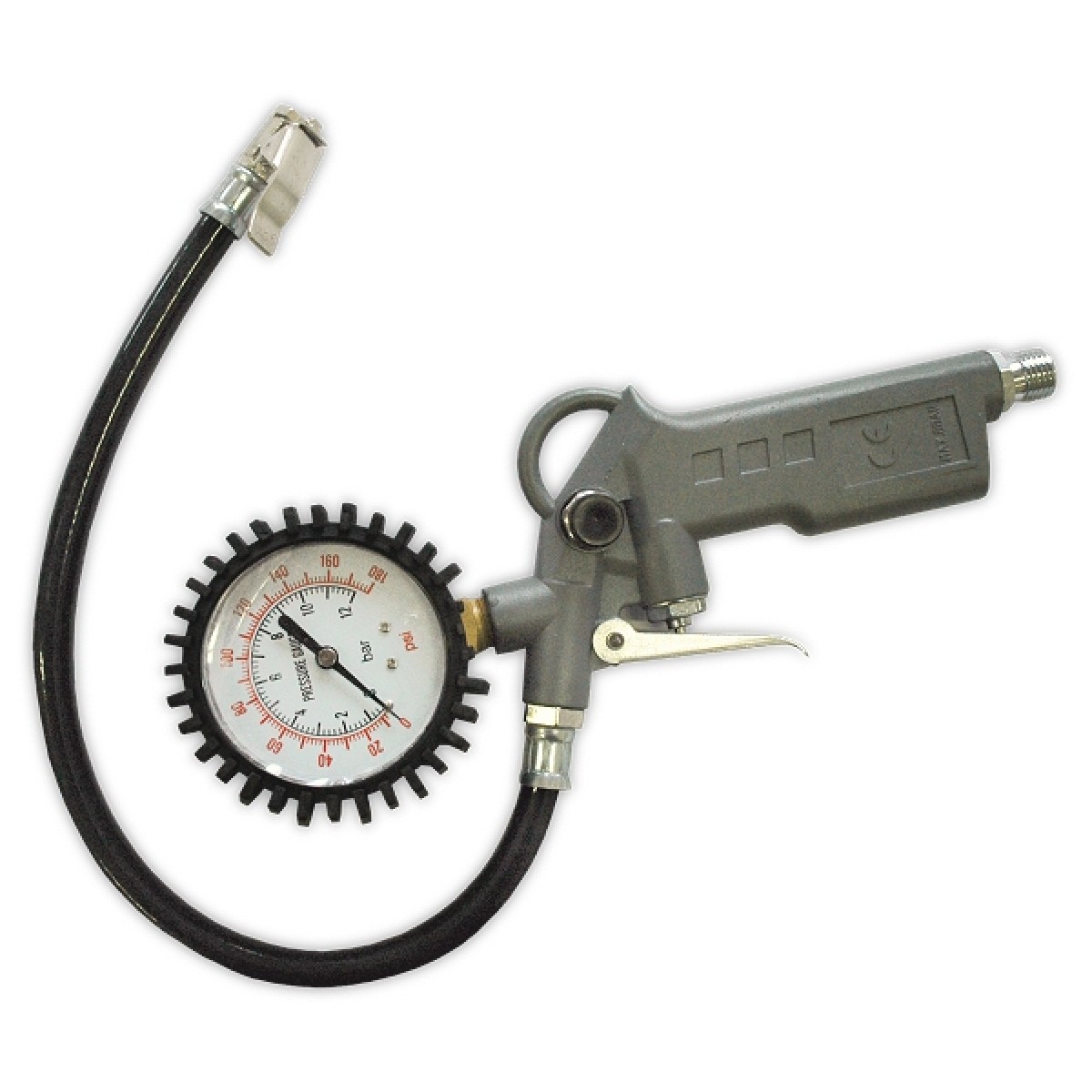 Пистолет для накачки шин с манометром и клапаном аварийного сброса сжатого воздуха. Упаковка в блистере.