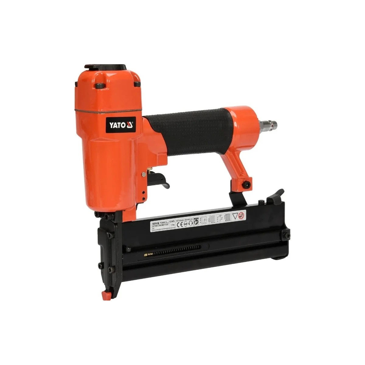 Профессиональный пневматический степлер для сборочных и отделочных работ. Предназначен для забивания скобы с шагом 5,5 мм и длиной от 25-40 мм и плоских гвоздей длиной 05-10-50 мм. Имеет вращающееся сопло для выпуска воздуха, соединение 1/4BSP, носик оснащен предохранителем для защиты от случайного применения скоб. Корпус изготовлен из литого под давлением алюминия.