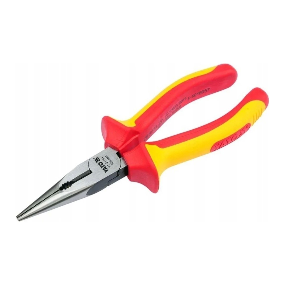 YT-21154 Удлиненные прямые плоскогубцы с изоляцией VDE, изготовленные из высококачественной стали CrV. Полукруглый и конический профиль губок с очень точно выполненными пазами и прочным режущим элементом.