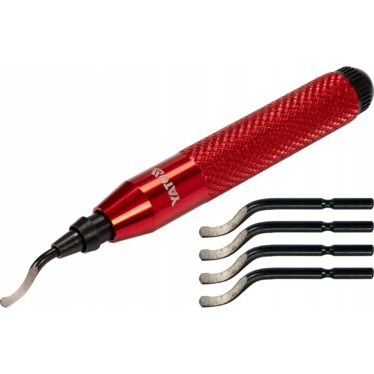 Устройство для снятия заусенцев с вращающимся лезвием HSS M2 и прочным корпусом из анодированного алюминия. Внутри корпуса имеется 5 запасных лезвий.