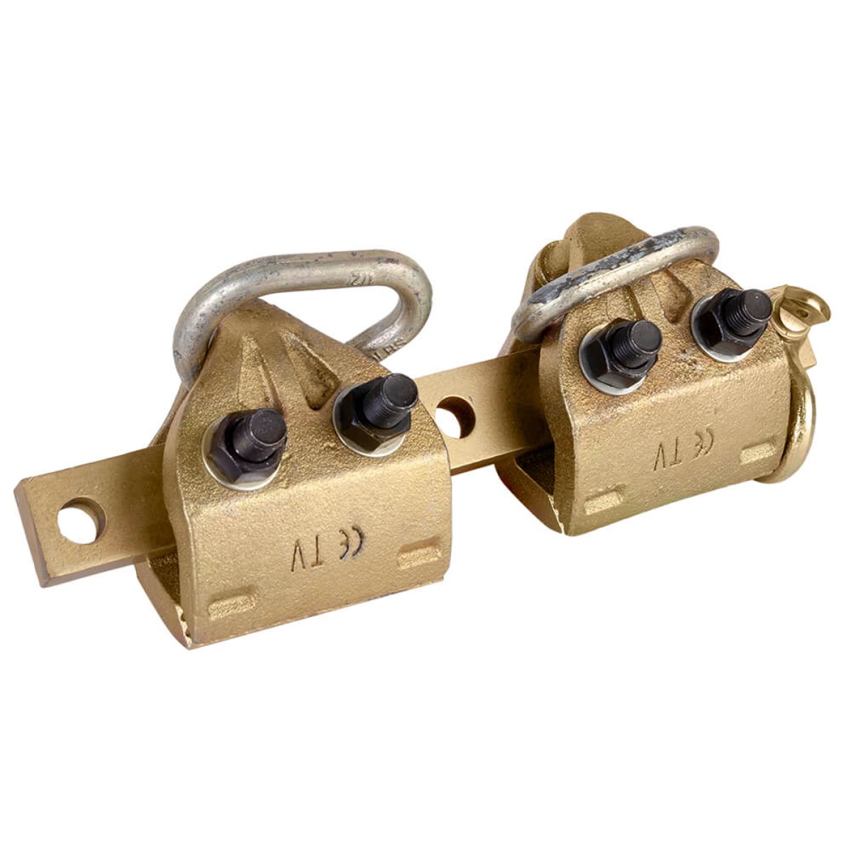 Приспособление оснащено сдвоенным широким болтовым зажимом с губками, имеющими зубчатые поверхности, и двумя серьгами, которые позволяют прилагать тяговое усилие с двух направлений.