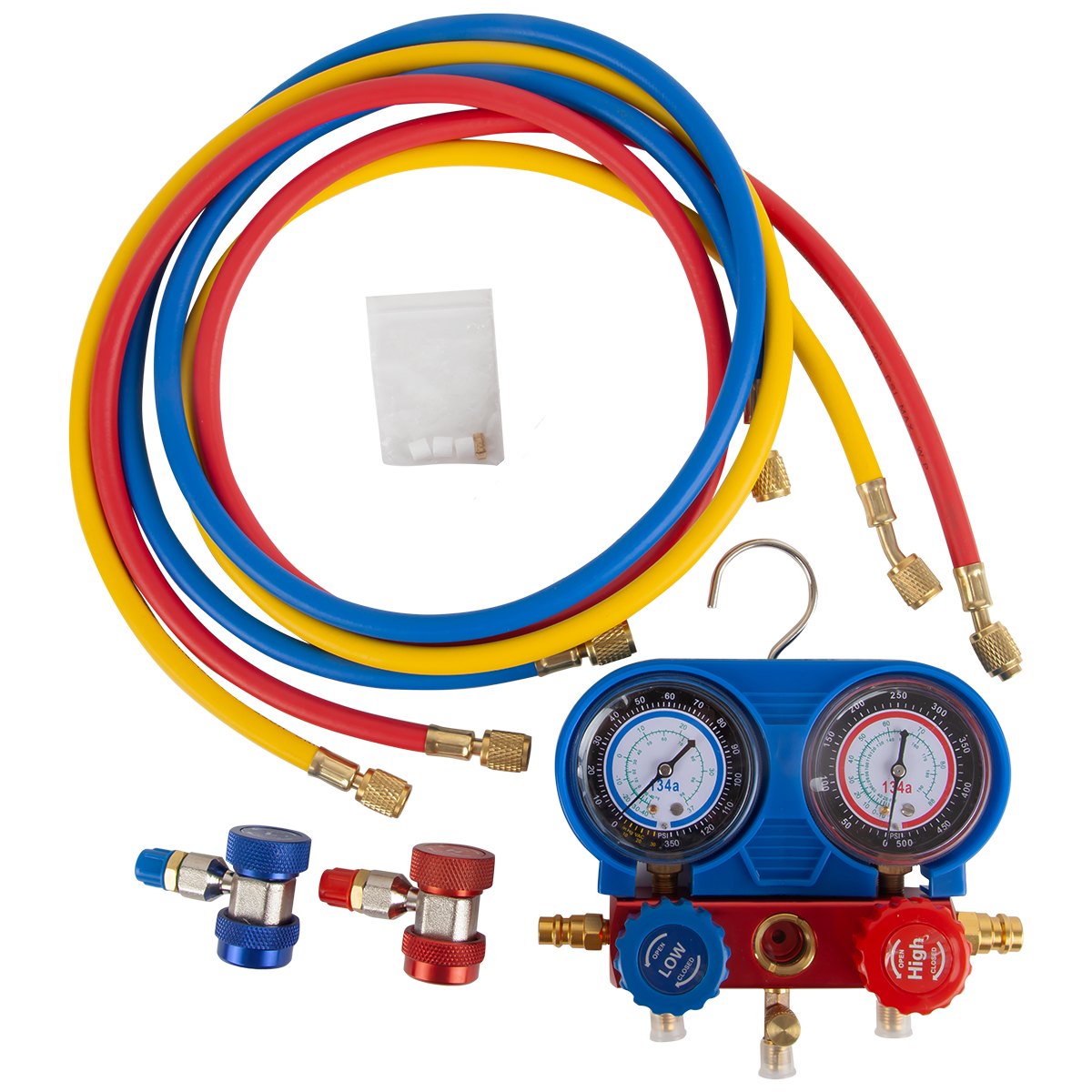В наборе 3 шланга: красный, синий и желтый. Красный — подключается к контуру с высоким давлением. Синий — к контуру с низким давлением.