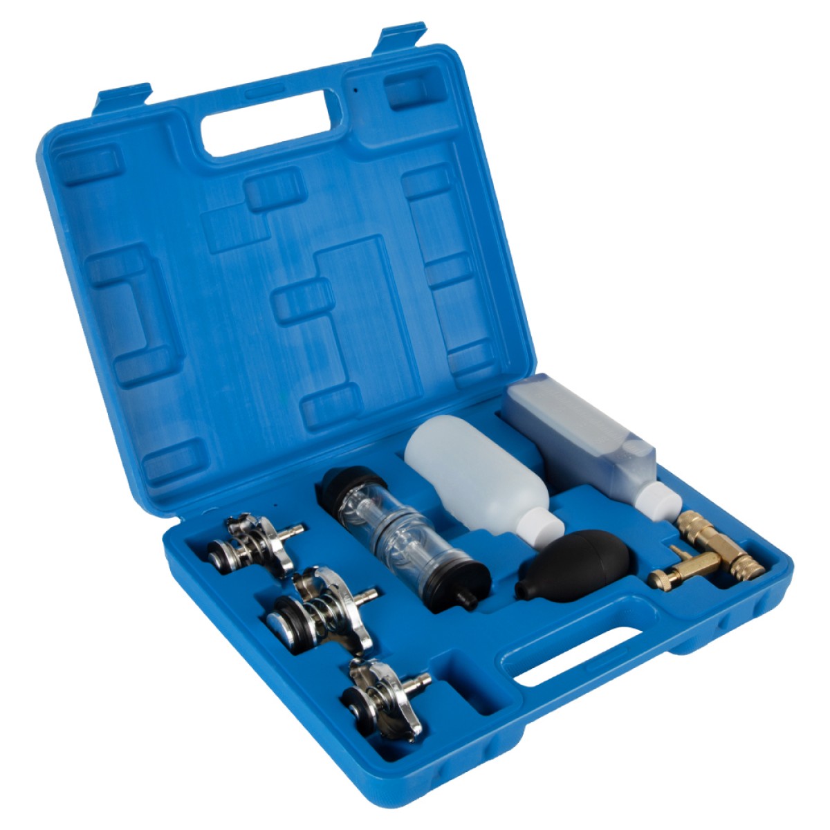 Набор для проверки утечек СО2 WiederKraft WDK-214080 предназначен для поиска нежелательного углекислого газа в системе охлаждения. С его помощью можно легко определить утечку выхлопных газов в антифриз и, соответственно, вовремя осуществить ремонтные работы. Индикаторная выявляющая жидкость входит в комплект. Тестер устанавливается в заливную горловину бачка охлаждающей жидкости. Отработавшие газы, попадая в систему охлаждения двигателя, накапливаются в «воздушной подушке» радиатора или расширительного бачка. Тестер анализирует состав смеси, тестовая жидкость меняет цвет с голубого на желтый, при наличии выхлопных газов в системе для бензиновых двигателей, и на зеленый, при наличии выхлопных газов в системе для дизельных двигателей. Обычный метод часто дает неправильный результат, так как присутствующие в воздухе частицы щелочи могут нейтрализовать эффект присутствия CO2, показывая что утечки нет, когда она присутствует. Эти частицы абсорбируются первой камерой тестера, которая действует как фильтр, позволяя только воздуху и CO2 достигать второй — верхней камеры. Если жидкость в верхней камере меняет цвет на желтый или зеленый, это факт свидетельствующий о наличии CO2 в антифризе и соответственно о прорыве выхлопных газов в систему охлаждения. Каждый компонент набора для проверки утечек СО2 надежно зафиксирован в индивидуальной ячейке прочного переносного кейса, что гарантирует сохранность комплекта во время транспортировки.