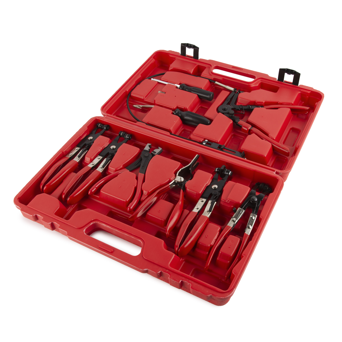 Клещи для самозажимных хомутов с гибким захватом. Оптимальны для проведения работ с хомутами на масляных, водяных и топливных шлангах транспортных средств. Для фиксации хомута в разжатом виде в конструкции есть трещоточный механизм.