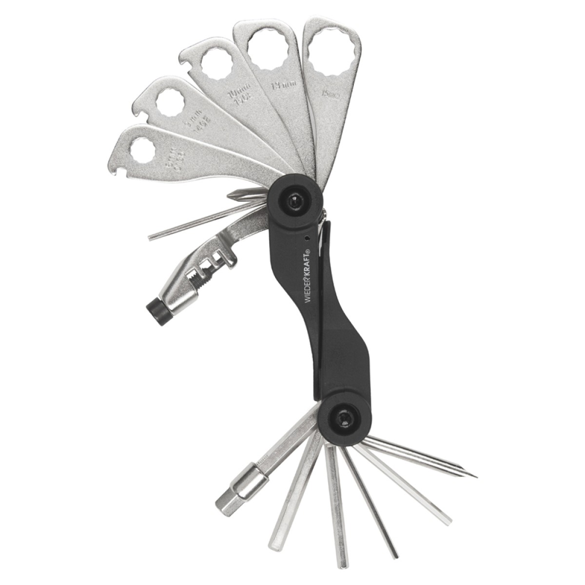 Мультитул для велосипеда WiederKraft WDK-21801 — самый необходимый многофункциональный инструмент в компактном исполнении. Удобный и практичный набор, который имеет высокую прочность и подходит для проведения ремонтных работ с велосипедом. Объединяет в себе 18 наиболее необходимых ручных инструментов (шестигранники, отвертки, накидные ключи, экстрактор заклепок цепи). Специальная форма позволяет максимально полно охватить детали. Благодаря жесткости инструмента усилие распространяется в нужном направлении, а это позволяет избегать деформации или изгибов. Мультитул имеет компактный складной корпус, благодаря чему не занимает много места в кармане или сумке. С набором WDK-21801, вы можете быть уверены, что доедете до пункта назначения в любой ситуации.