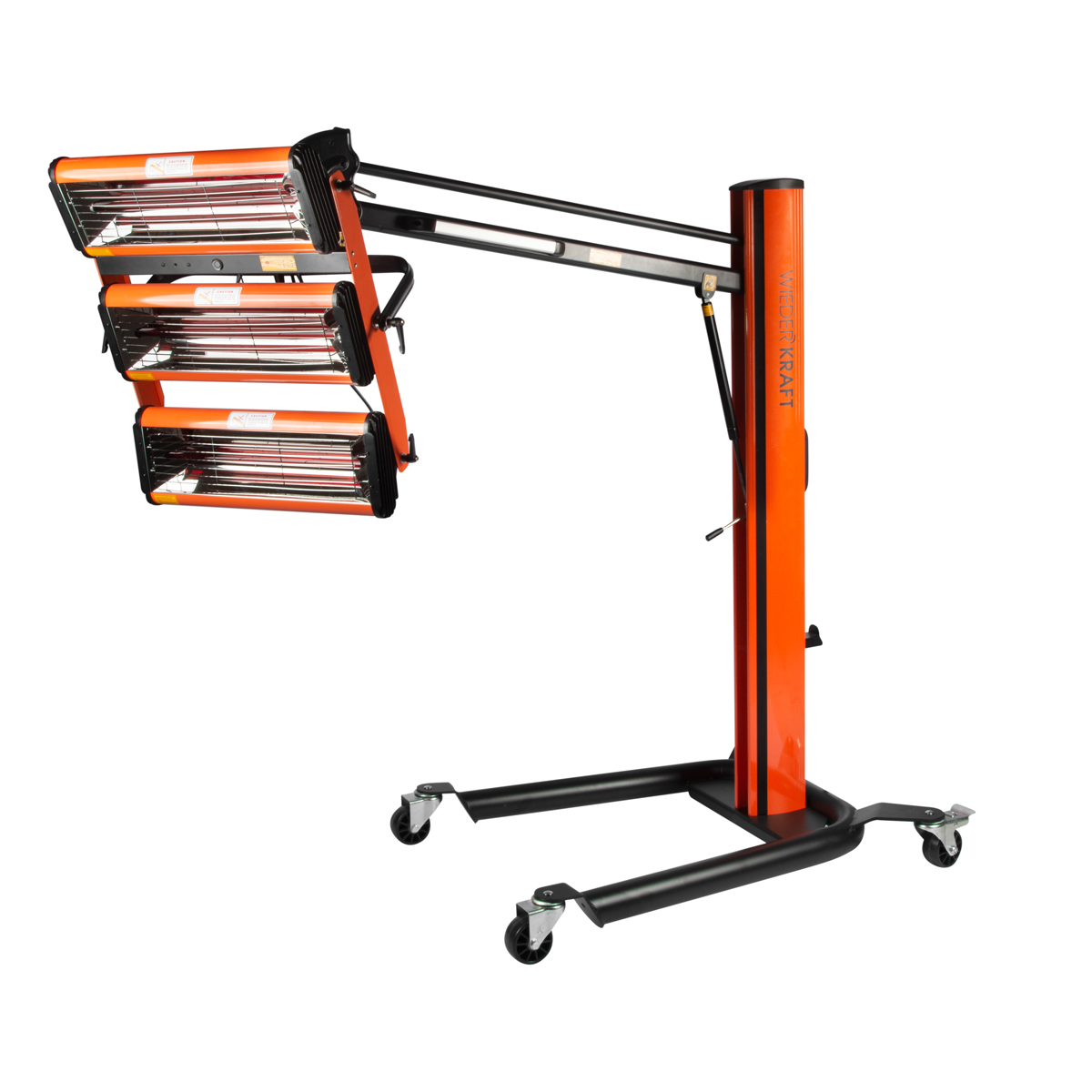 Профессиональная трехкассетная мобильная ИК-сушка для ЛКП на пантографической стойке. Кассетный блок легко поднимается на высоту 2300 мм, позволяя сушить даже крышу автомобиля. Стойка прибора оборудована газовым амортизатором для поддержки и изменения положения кассетного блока. Регулировка положения кассет осуществляется с помощью крепёжных винтов с удобной ручкой.