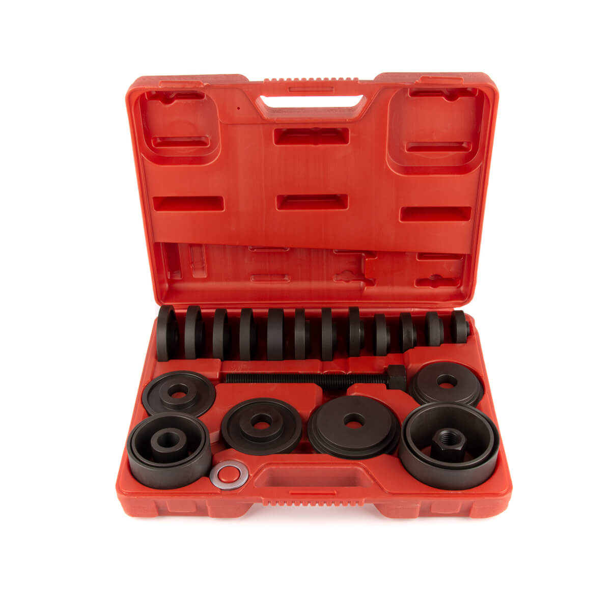Набор для выпрессовки и запрессовки ступичных подшипников в пластиковом кейсе. Изготовлен из специальной инструментальной стали, обладающей повышенной стойкостью к нагрузкам.