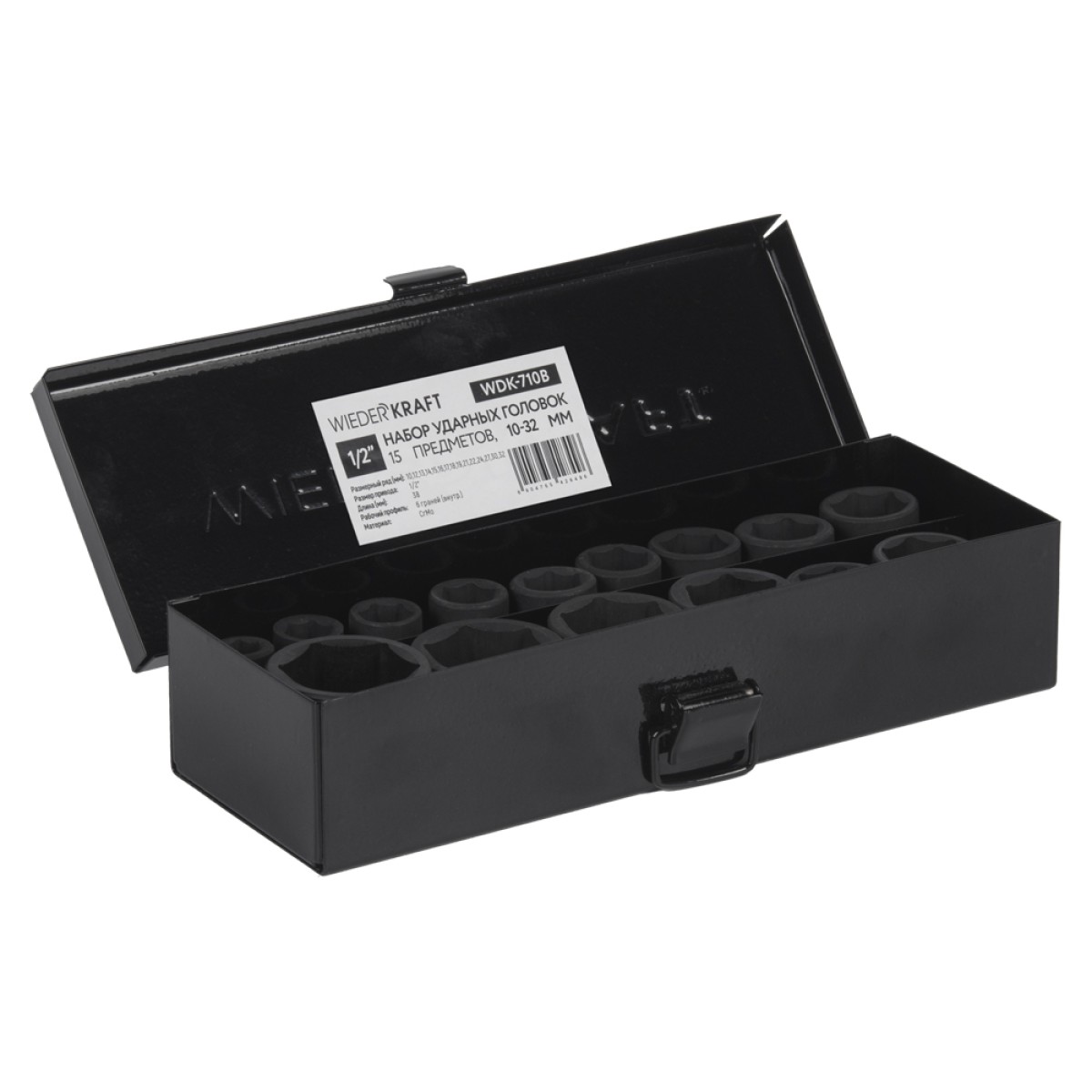 Набор ударных головок WiederKraft WDK-710B для монтажа/демонтажа крепежных элементов с помощью ударного гайковерта. Набор включает в себя пятнадцать головок (10, 12, 13, 14, 15, 16, 17, 18, 19, 21, 22, 24, 27, 30 и 32 мм) с посадочным квадратом 1/2″ и 6-гранным рабочим профилем. Все ударные головки выполнены из высококачественной хром-молибденовой стали 42 CrMo. Включения хрома и молибдена делают изделие прочным, устойчивым к нагрузкам и деформациям. Данный набор применяется при проведении слесарных работ для демонтажа и монтажа резьбовых соединений с помощью инструмента ударного действия (пневматические и электрические гайковерты). Головки имеют шестигранный профиль с технологией нагрузки вне угла, которая уменьшает скругление граней крепежа даже после многократного использования. Каждая головка аккуратно уложена в металлическом кейсе с защелкой из нержавейки, который обеспечивает безопасное хранение и удобную транспортировку набора.