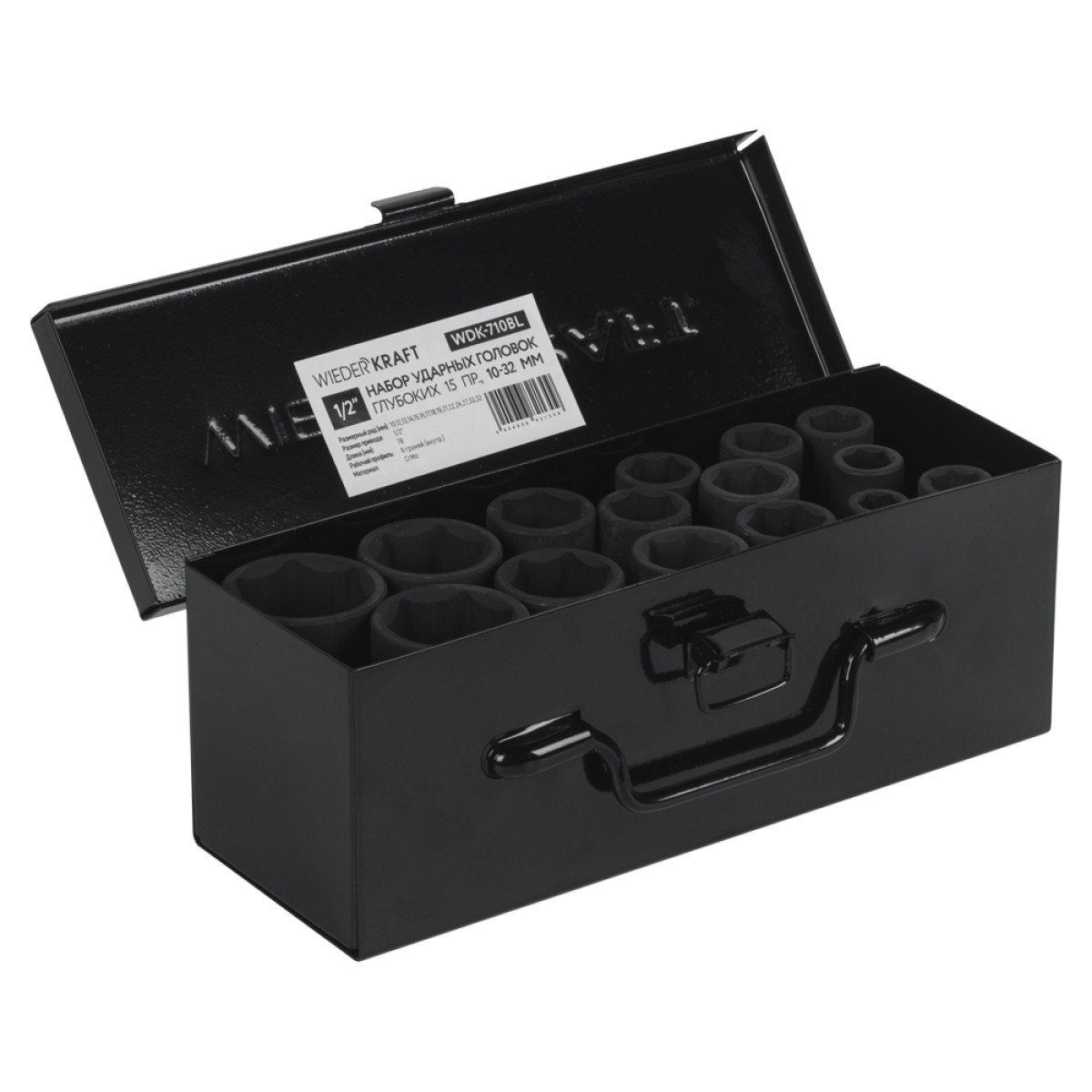 Набор глубоких ударных головок WiederKraft WDK-710BL для монтажа/демонтажа крепежных элементов с помощью ударного гайковерта. Набор включает в себя пятнадцать головок ( 10, 12, 13, 14, 15, 16, 17, 18, 19, 21, 22, 24, 27, 30 и 32 мм) с посадочным квадратом 1/2″ и 6-гранным рабочим профилем. Все ударные головки выполнены из высококачественной хром-молибденовой стали 42 CrMo. Включения хрома и молибдена делают изделие прочным, устойчивым к нагрузкам и деформациям. Данный набор применяется при проведении слесарных работ для демонтажа и монтажа резьбовых соединений с помощью инструмента ударного действия (пневматические и электрические гайковерты). Головки имеют шестигранный профиль с технологией нагрузки вне угла, которая уменьшает скругление граней крепежа даже после многократного использования. Каждая головка аккуратно уложена в металлическом кейсе с защелкой из нержавейки, который обеспечивает безопасное хранение и удобную транспортировку набора.