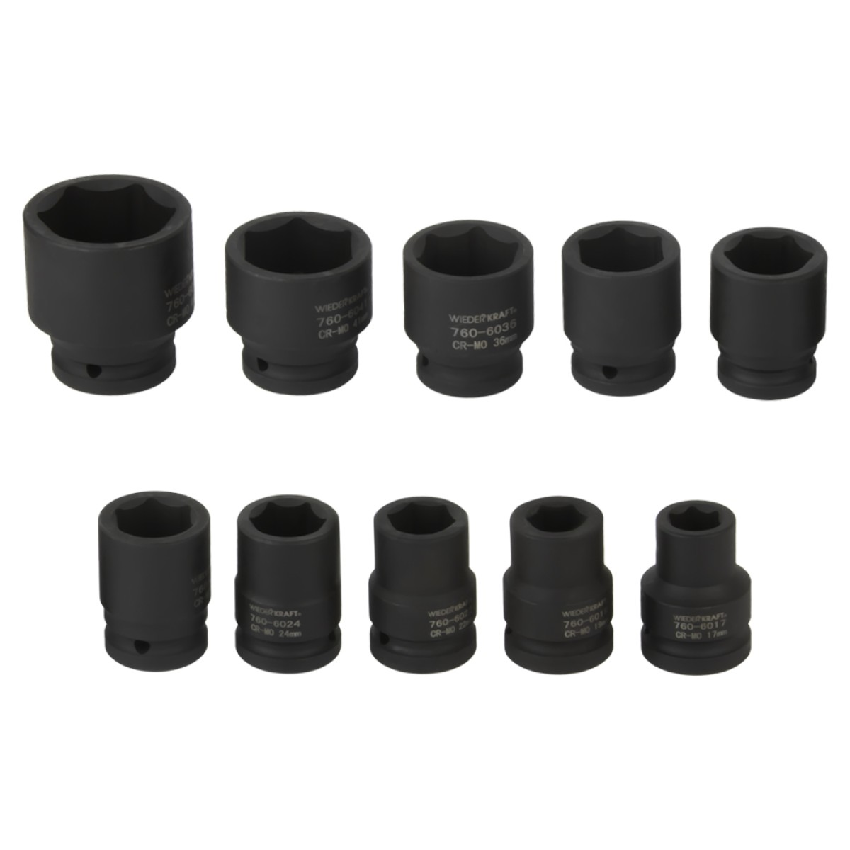 Набор ударных головок WiederKraft WDK-760 для монтажа/демонтажа крепежных элементов с помощью ударного гайковерта. Набор включает в себя десять головок (17, 19, 22, 24, 27, 30, 32, 36, 41 и 46 мм) с посадочным квадратом 3/4″ и 6-гранным рабочим профилем. Все ударные головки выполнены из высококачественной хром-молибденовой стали 42 CrMo. Включения хрома и молибдена делают изделие прочным, устойчивым к нагрузкам и деформациям. Данный набор применяется при проведении слесарных работ для демонтажа и монтажа резьбовых соединений с помощью инструмента ударного действия (пневматические и электрические гайковерты). Головки имеют шестигранный профиль с технологией нагрузки вне угла, которая уменьшает скругление граней крепежа даже после многократного использования. Каждая головка аккуратно уложена в металлическом кейсе с защелкой из нержавейки, который обеспечивает безопасное хранение и удобную транспортировку набора.