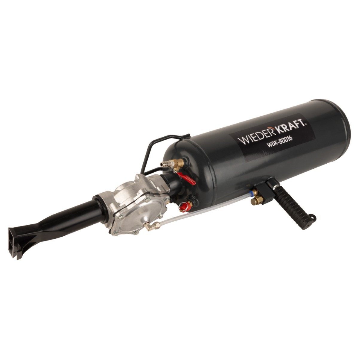 Пневматический бустер взрывной накачки колес WiederKraft WDK-80016 – профессиональное устройство для монтажа шин. Обеспечивает быстрое и надежное прилегание борта шины к колесному диску за счет стремительного выхода из устройства большого объема сжатого воздуха, благодаря чему борт шины мгновенно садится на посадочное место и достигается необходимая герметичность его прилегания. Небольшой вес устройства, а также его компактный размер обеспечивают мобильность и легкость использования. Удобная рукоятка со стартовой кнопкой и автоматический выпускной клапан обеспечивают быстрый выход большого объема сжатого воздуха. Две ручки на корпусе позволяют оператору держать бустер двумя руками. Наличие предохранительного клапана делает работу более безопасной. Сопло для выпуска воздуха имеет специальную форму и упор, обеспечивающие его эффективное расположение между ободом колеса и бортом шины. Оно изготовлено из пластика, что исключает повреждения колёсного диска и шины.