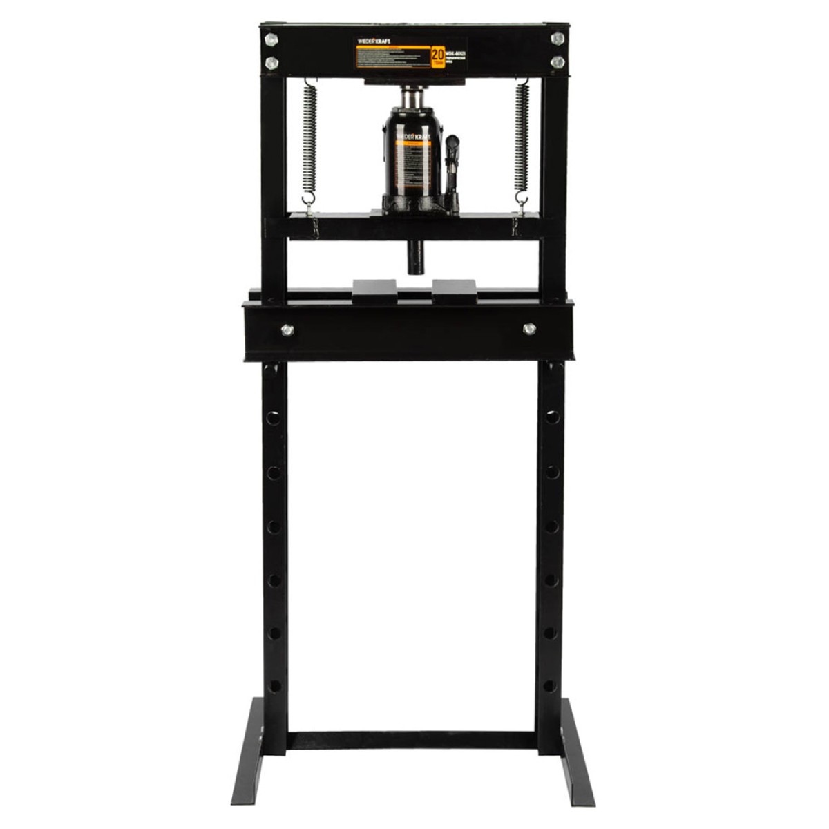 Напольный гидравлический пресс с бутылочным домкратом WiederKraft WDK-80121, который обеспечивает усилие в 20000 кг. Гидравлический напольный пресс применяется в автосервисах, СТО, ремонтных мастерских и на производственных предприятиях для установки и съема деталей автомобиля и других транспортных средств, а также для аккуратной правки, гибки и запрессовки заготовок. Силовым элементом конструкции является гидравлический бутылочный домкрат, который приводится в действие при помощи рукояти. Устойчивое положение модели обеспечивается благодаря поперечным пластинам основания. Отверстия стоек позволяют с легкостью менять высоту стола (рабочий диапазон составляет 0-910 мм).