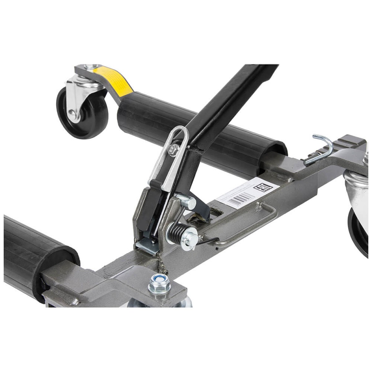 Колесная тележка с механическим подъемным механизмом применяется для эвакуации и перемещения по территории автосервиса или стоянки автомобилей с заблокированными или отсутствующими колесами, заблокированными АКПП, сломанными шаровыми опорами.