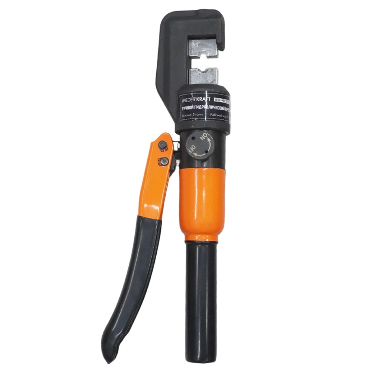 Ручной гидравлический пресс WiederKraft WDK-PR0307050, который обеспечивает усилие в 5000 кг и диапазон опрессовки 4-70 мм². Предназначен для опрессовки наконечников, гильз, а так же различных натяжных, соединительных, ответвительных и аппаратных зажимов при монтаже проводов и тросов линий электропередачи и открытых распределительных устройств. Кримпер отличается особенной конструкцией: на одной ручке установлен гидроцилиндр, связанный с обжимной головкой посредством штока. Другая рукоятка соединена с поршнем. Рабочая часть замыкается наподобие ножниц, впоследствии чего достигается надежная опрессовка кабеля гильзой или наконечником. Это может быть витая пара, телефонный, коаксиальный, медный, силовой или сетевой кабель. Надежный гидравлический механизм многократно протестирован и рассчитан для длительной эксплуатации. Плавность хода увеличена на 50% за счет сокращения длины шага при закрытии обжимного штампа. Клапан сброса давления имеет встроенную защиту от перегрузки, что обеспечивает безопасное использование. Полный сброс гидравлического клапана позволяет эффективно управлять процессом прессования. В комплекте предусмотрены восемь сменных матриц под провода разного сечения. Сменные матрицы устанавливаются в посадочные отверстия в верхней части рабочей головы и штоке. Гексагольнальный профиль опрессовки обеспечивает равномерное обжатие хвостовика наконечника или кабельной жилы по всему периметру.